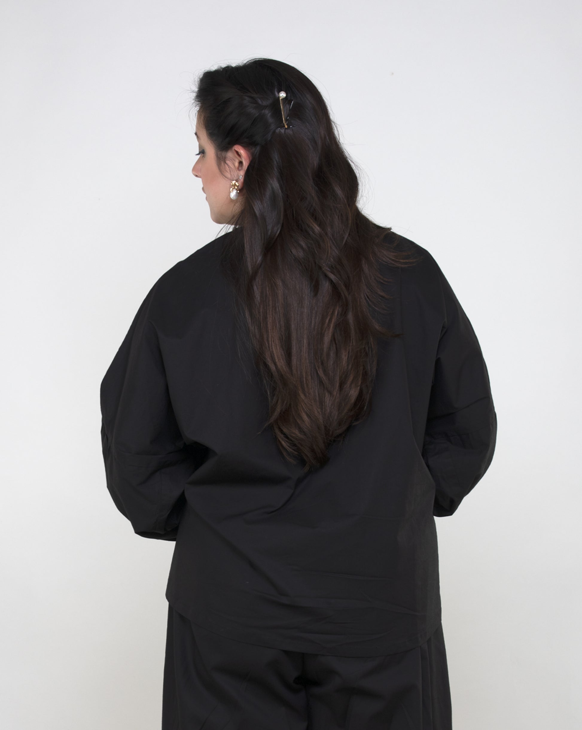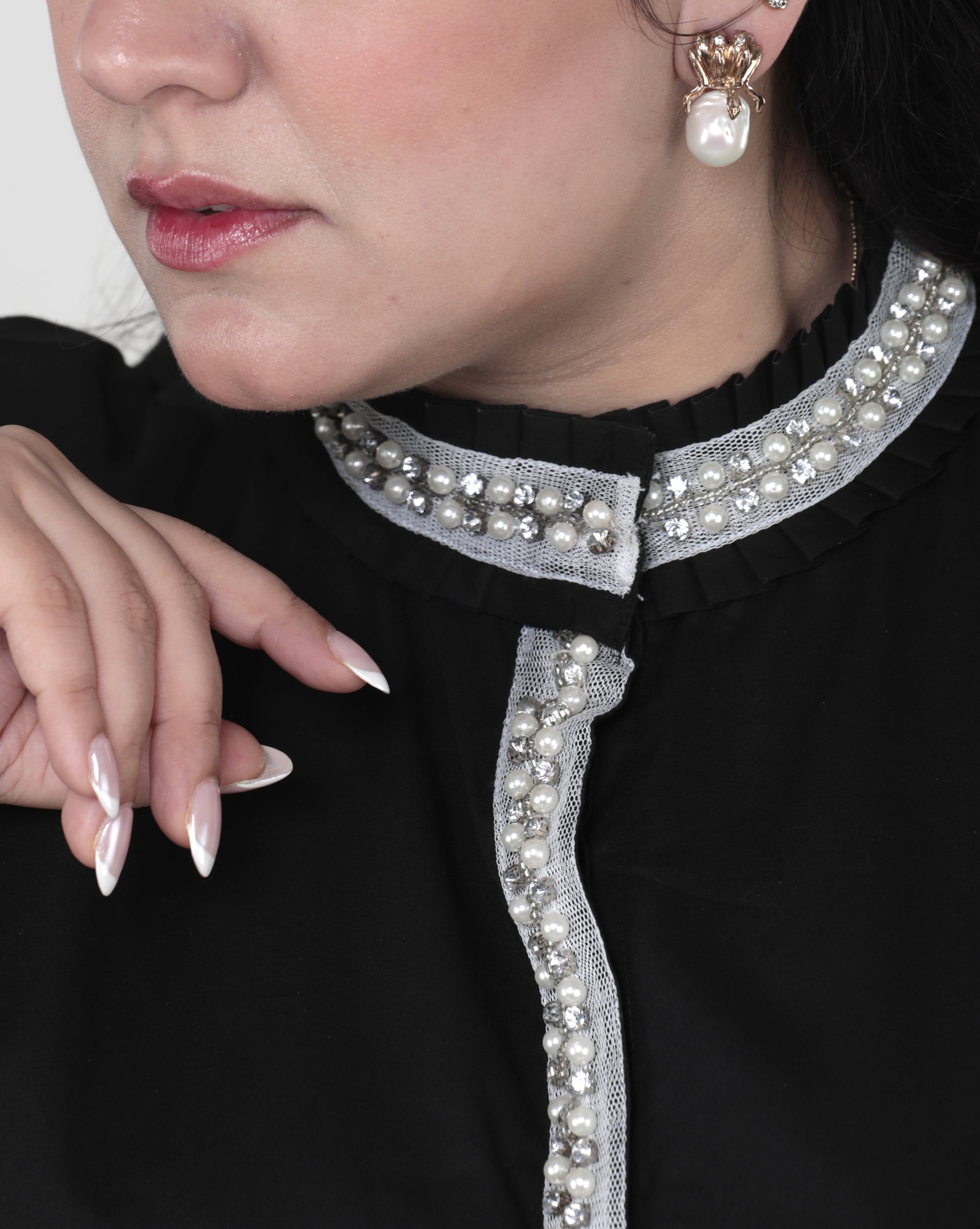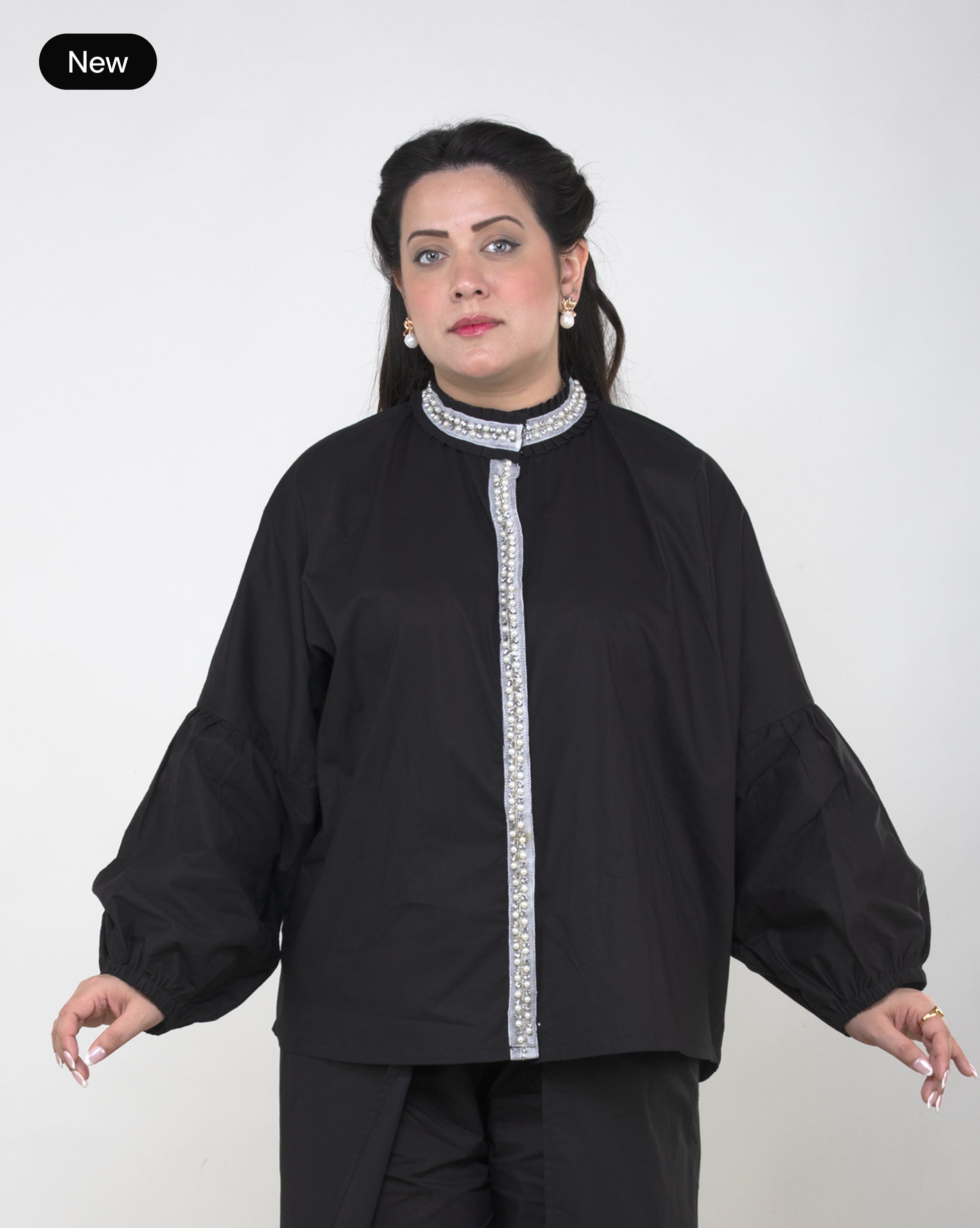 The Black Beaded Shirt for Women is crafted from breathable cotton and features a chinese collar, voluminous sleeves, and a silver beaded placket that adds subtle shine. Its relaxed fit and classic black color make it easy to style with trousers or coordinate effortlessly as part of a set. Wear it to work or for a comfy dinner with friends.