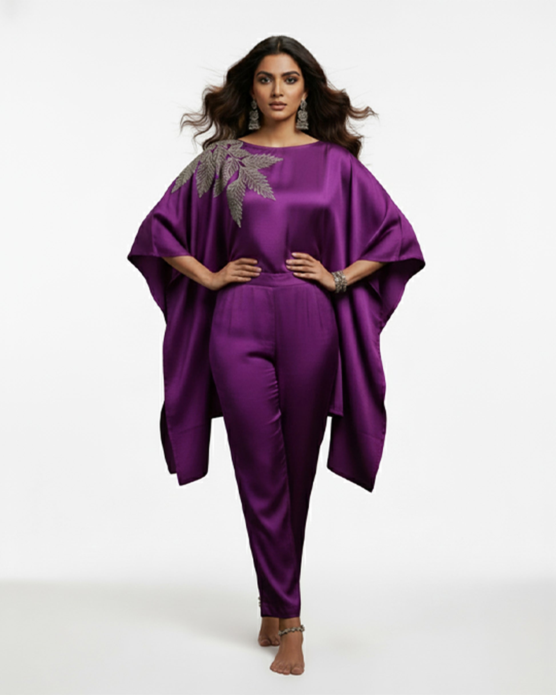 Drench yourself in the vibrant luxury of this monochromatic pure silk ensemble, dyed in a rich onion purple hue. The free-flowing kaftan top offers a beautiful drape, flawlessly complemented by tailored, straight-fit silk pants. A striking hand-embroidered silver leaf patch cascades elegantly from the shoulder, adding a touch of couture glamour. Versatile by design, wear the top tucked in for structure or leave it free-flowing for an effortless, regal statement.