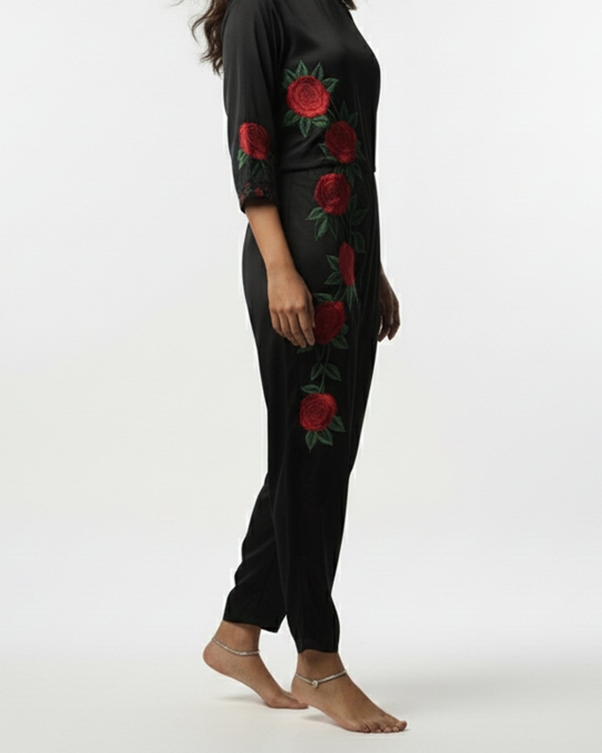 This chic, tailored jumpsuit redefines modern luxury with its precise fit-to-size silhouette crafted from lustrous black pure silk. The striking, boho-inspired design features elegant hand-embroidered roses cascading dramatically down one side, creating a unique, asymmetrical statement. A perfect blend of structured tailoring and artistic floral flair, it's designed for the contemporary connoisseur.